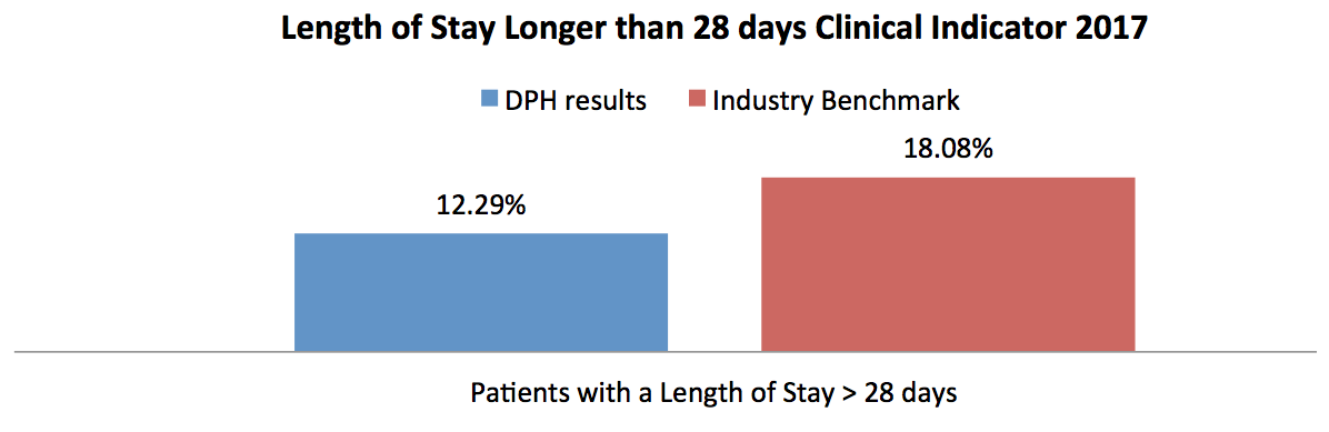 This clinical indicator focuses on the length of stay in an acute inpatient unit. At Delmont the focus is not on how long a patient is in the Hospital, but ensuring they get the care they need as efficiently as possible and discharge them from the Hospital as soon as they are ready.