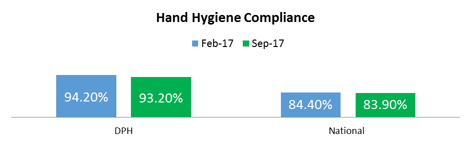 Regular audits of compliance with correct hand hygiene are undertaken and results are compared with national results, shown below -